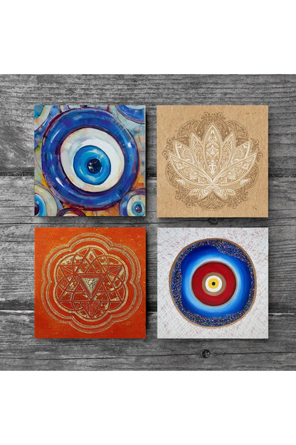 Nazar, Lotus Çiçeği, Sri Yantra -SC386- Doğal Taş Bardak Altlığı 4’lü Set (10x10 cm)